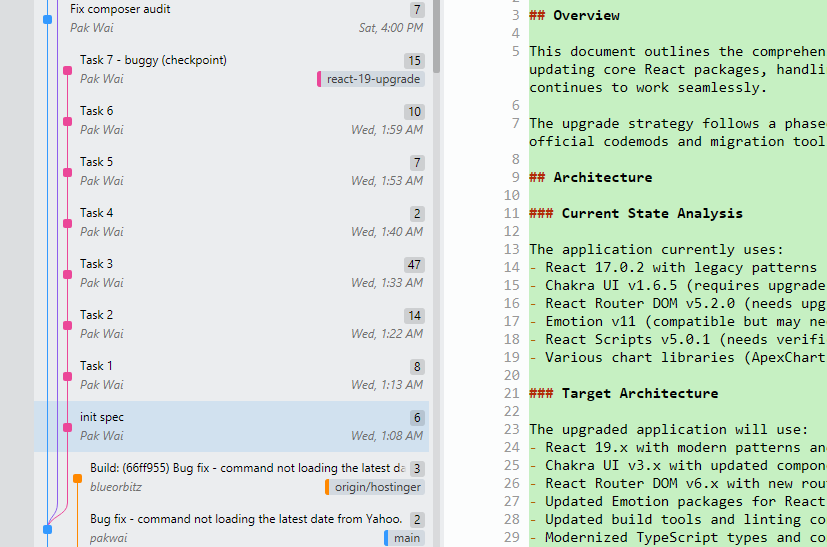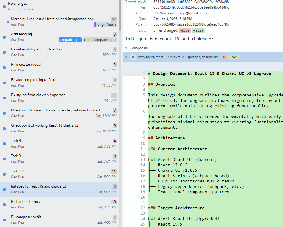 I began with a spec-driven approach using Kiro AI to plan the upgrade from React 17 to 19. At first, I didn’t realize that Chakra UI would also need a major version bump. The initial plan looked solid — requirements were clear, tasks were well-defined, and I thought this would be straightforward.
